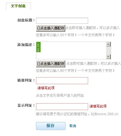 從上圖可以看出360點(diǎn)睛的創(chuàng)意添加編輯形式和百度鳳巢基本相同